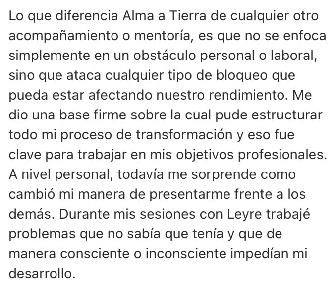 Lo que diferencia Alma a Tierra de cualquier otra mentoría o proceso, es que no se enfoca simplemente en un obstáculo personal o laboral, sino que ataca cualquier tipo de bloqueo que pueda estar afectando nuestro rendimiento. Durante mis sesiones con Leyre trabajé problemas que no sabía que tenía y que de manera consciente o inconsciente impedían mi desarrollo. Gracias! Excelente y muy completa!”