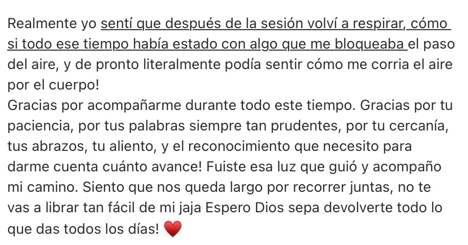 Lo que más valoré fue el acompañamiento. Me sentí vista, sentí que tenía mucho apoyo y sobre todo entendimiento sin ningún prejuicio. Me ayudó a ser sincera conmigo misma y a confiar en otros lo cual era difícil en el pasado y también claridad en muchos aspectos sobre mi personalidad y emociones.
